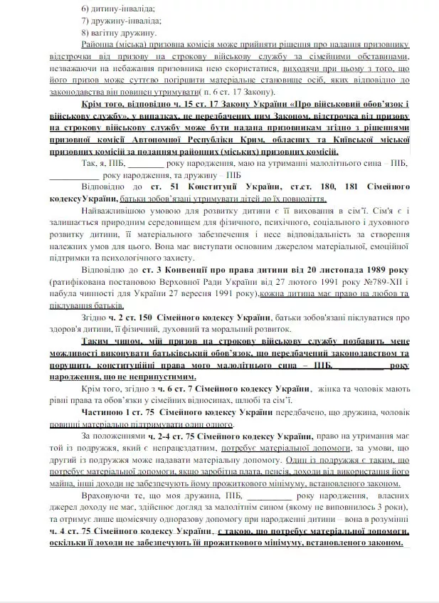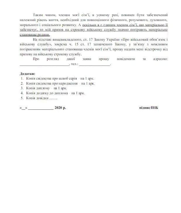 Загалом, заява на відстрочку від мобілізації складається у довільному порядку, однак має бути належним чином обґрунтована, з посиланням на законодавство та додаванням підтверджувальних документів. Зокрема, це можуть бути: