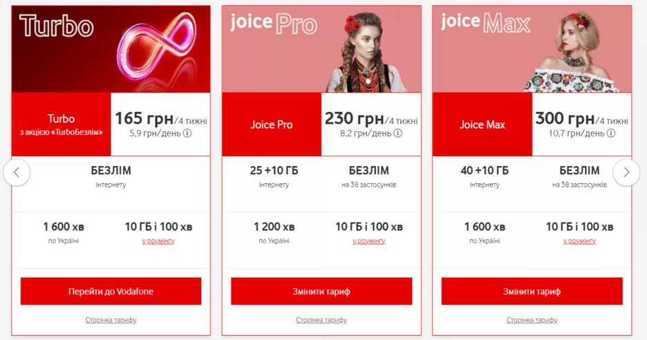 Joice Pro предлагает 25 ГБ + 10 ГБ интернета, безлим на 38 мобильных приложений, 1 200 минут на разговоры по Украине, а также 10 ГБ и 100 минут в роуминге. Joice Start дает 15 ГБ + 10 ГБ трафика, 800 минут на звонки. Остальные услуги в пределах обоих тарифных планов идентичны.