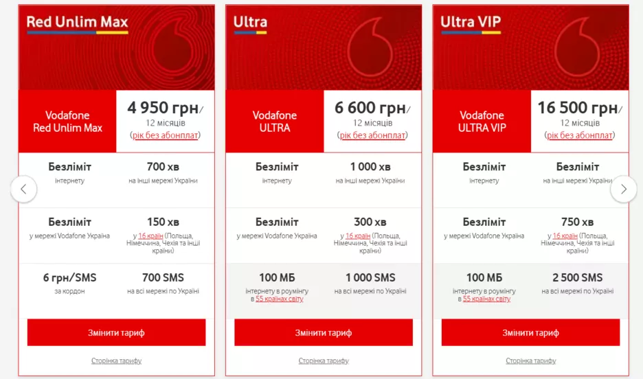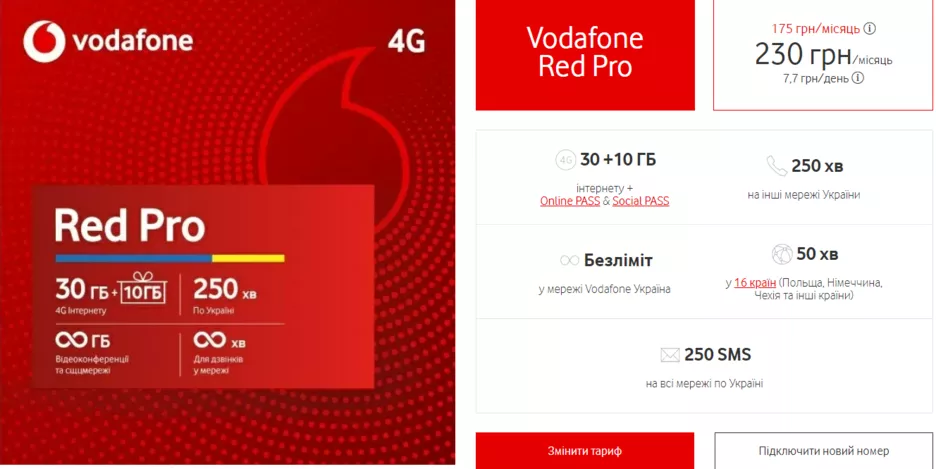 Контрактные абоненты Vodafone могут заказать пакет Red Pro за 2 530 грн в год, получая 30 ГБ + 10 ГБ, 250 минут на другие сети Украины, 50 минут в роуминге (16 стран) и 250 SMS.